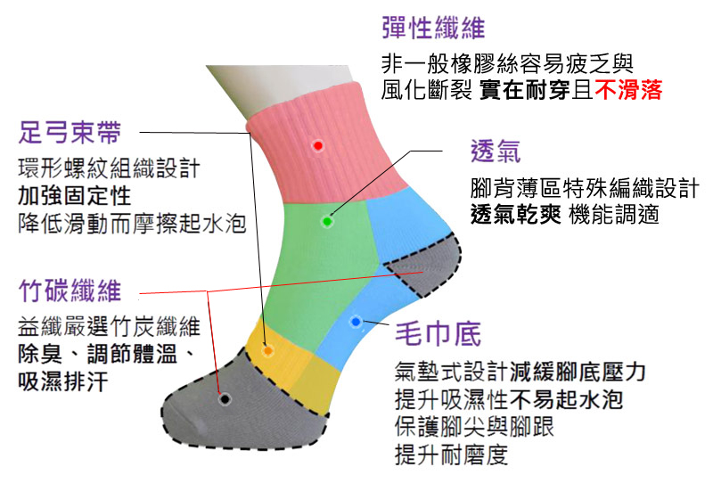 竹炭毛巾襪為台灣製造,品質可靠,襪底超厚毛巾並使用特殊技術織法,良好的吸濕及透氣性,避震效果好,減少運動傷害的發生率,彈性舒適。